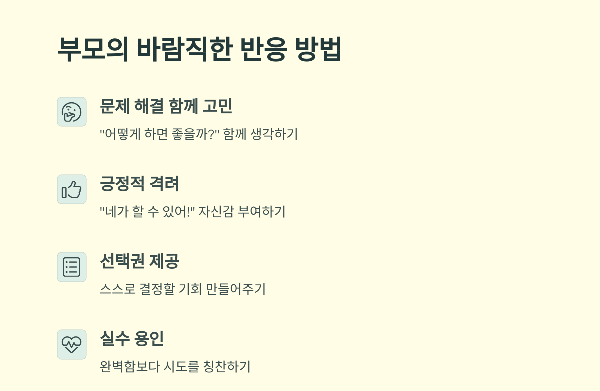 실수나 실패를 두려워하지 않는 가정 분위기를 만들어주세요. 실패했을 때 비난하기보다 "다음에는 어떻게 하면 더 잘할 수 있을까?"라고 함께 생각해보는 시간을 가지세요.