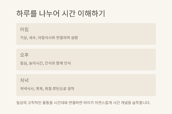 시간의 기본 단위를 이해시키는 것이 중요합니다. 아이가 접근하기 쉬운 하루의 주요 활동을 시간대와 연결하여 설명하면 더욱 효과적입니다.