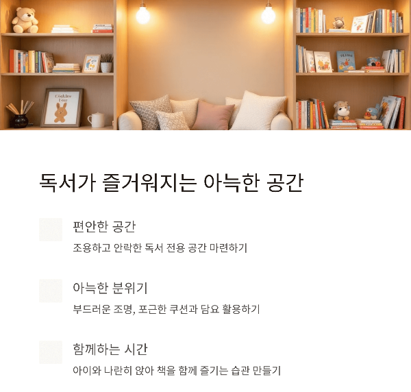 독서 공간 구성을 위한 실질적인 팁은 다음과 같습니다: 1) 아이 눈높이에 맞는 낮은 책장 배치 2) 책 표지가 보이도록 전면 진열 3) 푹신한 쿠션과 담요로 아늑한 독서 코너 만들기 4) 은은한 조명으로 눈의 피로도 줄이기 5) 주변 소음을 최소화한 조용한 환경 조성