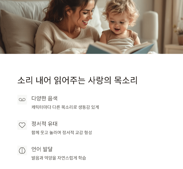 낭독 효과는 아이의 언어 발달과 정서적 유대감 형성에 큰 영향을 미칩니다. 목소리의 톤, 속도, 감정 표현을 통해 아이는 이야기에 더 깊이 몰입하게 됩니다.