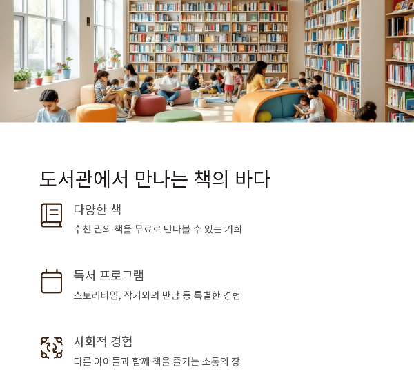 정기적인 도서관 방문은 아이에게 다양한 책을 접할 기회를 제공하고 책의 가치를 자연스럽게 인식하게 합니다. 도서관은 단순한 책 대여 공간을 넘어 풍부한 독서 경험을 제공하는 공간입니다.
