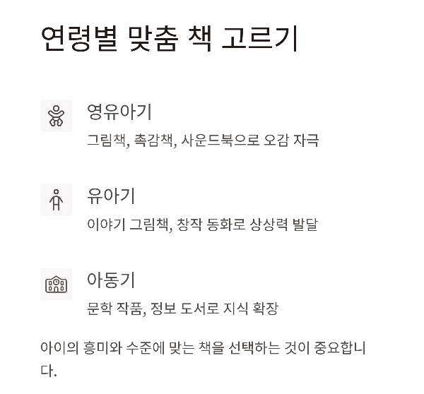 | 1~3세 | 그림 가리키며 읽기, 간단한 질문 | 10~15분씩 2회 |