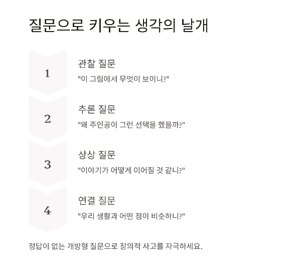 독서 후 개방형 질문을 통해 아이의 생각을 존중하고 표현할 기회를 제공하세요. 이는 아이의 비판적 사고력과 자신감 향상에 큰 도움이 됩니다.