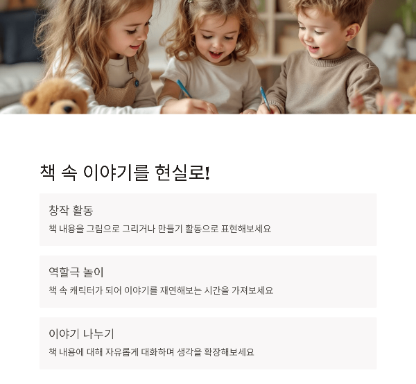 책 내용을 실생활과 연결하는 독후 활동은 아이의 이해력과 기억력을 높여줍니다. 단순히 읽고 끝내는 것이 아니라, 책 속 내용을 다양한 방식으로 경험하게 하세요.