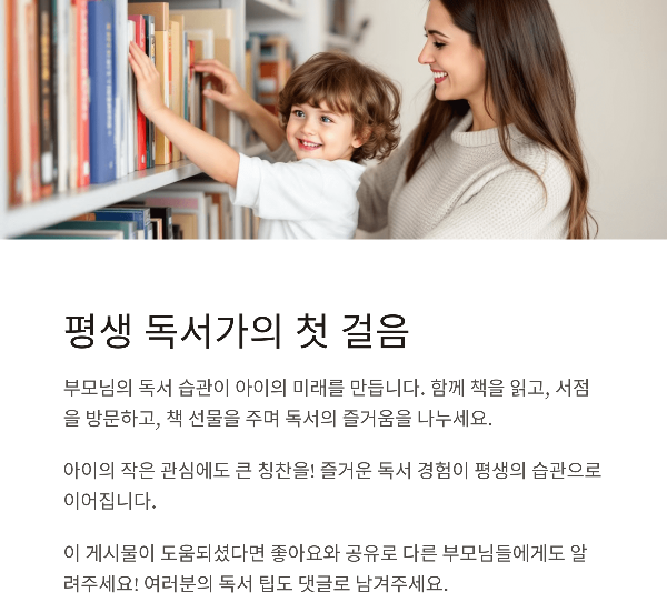 아이가 책에 자연스럽게 관심을 갖도록 독서 환경을 조성하는 것이 중요합니다. 집 안에 미니 도서관을 만들어 아이가 언제든지 책에 접근할 수 있게 하세요.