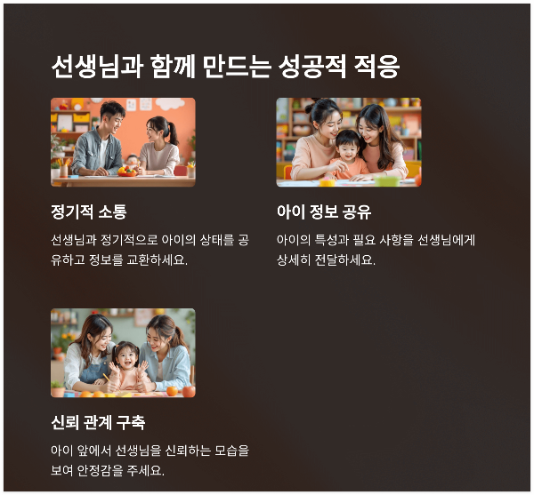 선생님과의 소통도 중요합니다. 아이의 성격, 습관, 알레르기 등 특이사항을 미리 공유하고, 적응 과정에서의 변화를 꾸준히 피드백 받으세요.