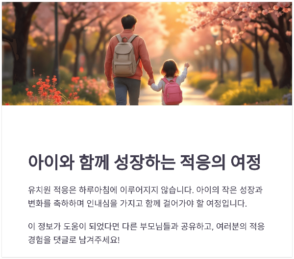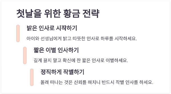 셋째, 과도한 걱정을 표현하지 마세요. 부모의 불안은 아이에게 그대로 전달됩니다. 유치원 적응 스트레스를 줄이려면 부모가 먼저 안정감을 보여야 합니다.