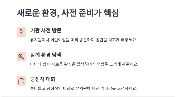 아이에게 새로운 환경에 대해 미리 설명하는 것은 매우 중요합니다. 연령에 맞는 대화법을 사용해 아이의 이해도를 높이세요.
