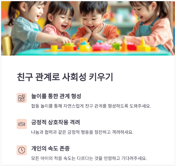 A: 모든 아이가 사회성 발달 속도가 다릅니다. 소규모 놀이 모임부터 시작해 점차 확대해보세요. 또래 관계 형성은 시간이 필요한 과정입니다.