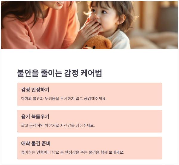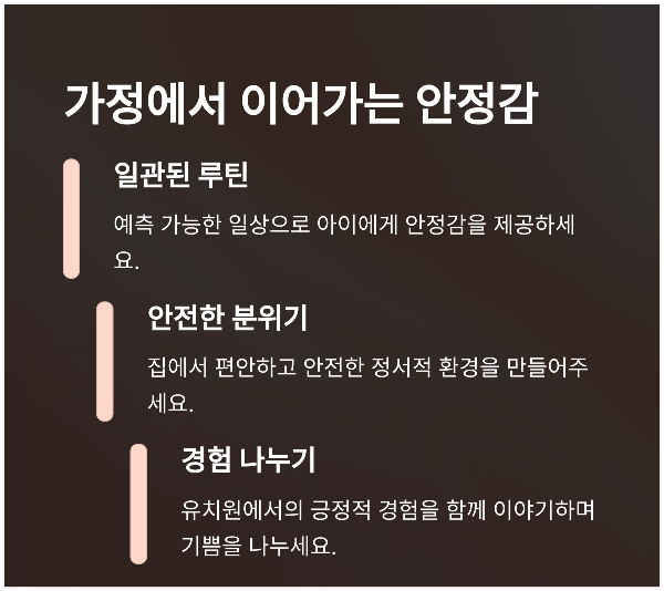 적응 기간 동안 부모는 아이에게 안정감을 제공하는 역할을 해야 합니다. 처음에는 함께 있다가 점차 시간을 늘려가는 단계적 적응법이 효과적입니다.