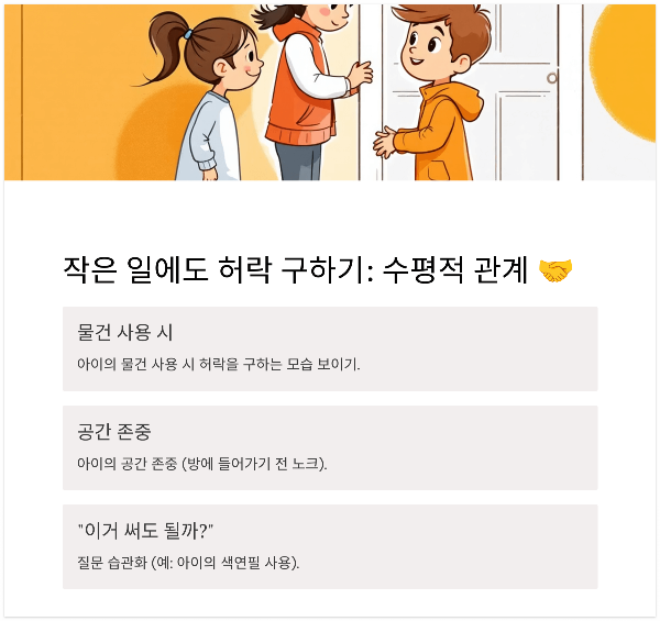 작은 일상에서 존중의 실천이 중요합니다. 사소한 행동 하나가 아이에게는 큰 의미가 됩니다.