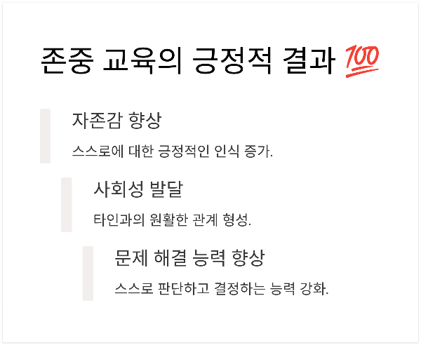 3. 존중의 효과: 아이의 자존감, 사회성, 자기주도성이 높아지고, 부모와의 신뢰도 깊어집니다
