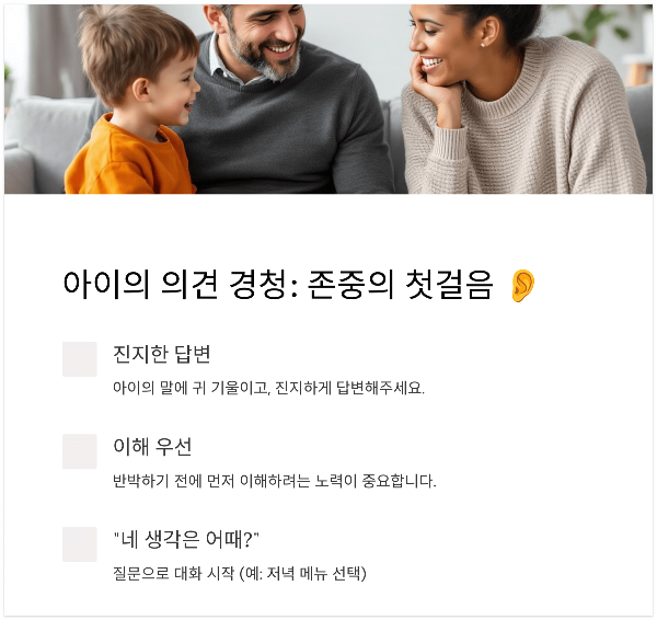4. 의견 존중: 아이의 의견을 무시하지 않고 진지하게 받아들이는 태도를 보여주세요