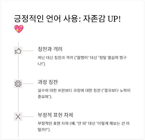 긍정적 언어는 아이의 성장에 큰 영향을 미칩니다. 단어 선택 하나로 아이의 자존감이 달라질 수 있습니다.