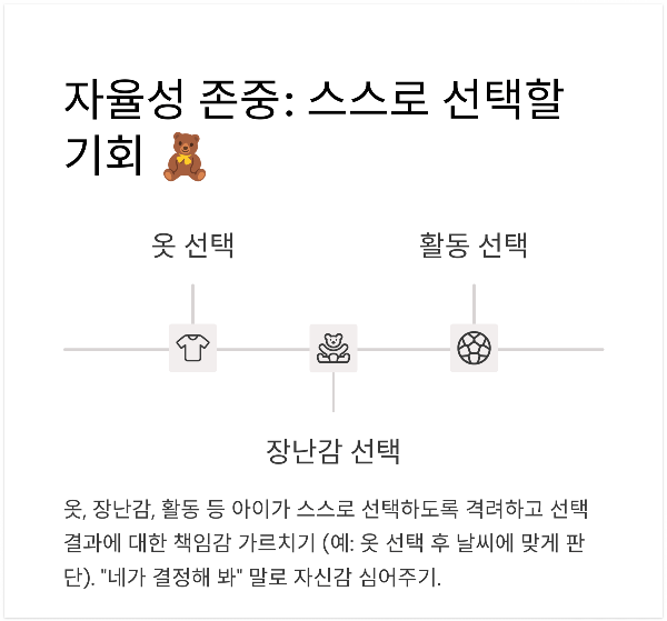 1. 독립성 존중: 아이가 스스로 할 수 있는 일은 직접 하도록 격려하세요